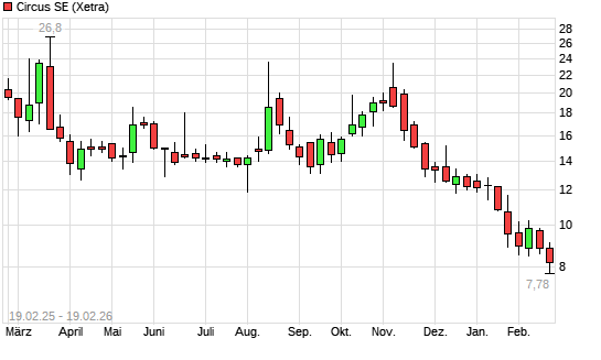 Mit dem Rücksetzer auf 7,96 EUR hat die Circus-Aktie (ISIN DE000A2YN355) am 18.02.2026 ein neues 12-Monats-Tief erreicht und damit den Kurs vom 17.02.2026 eingestellt.