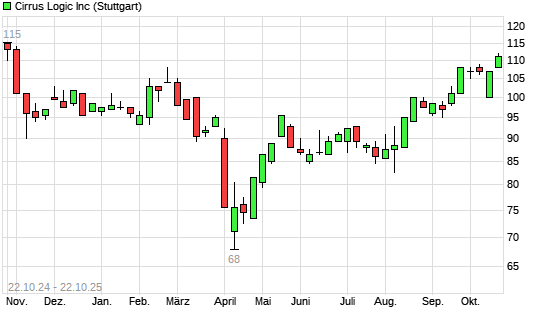 Mit dem Anstieg auf 112,00 EUR hat die Cirrus Logic-Aktie (ISIN US1727551004) am 21.10.2025 ein neues 6-Monats-Hoch erreicht und damit den Kurs vom 07.10.2025 eingestellt.