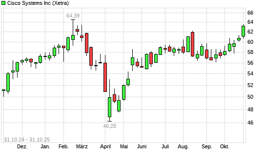 Mit dem Anstieg auf 62,71 EUR hat die Cisco-Aktie (ISIN US17275R1023) am 30.10.2025 ein neues 6-Monats-Hoch erreicht und damit den Kurs vom 28.10.2025 eingestellt.