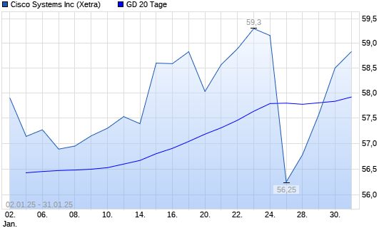 Mit dem Anstieg auf 58,22 EUR hat die Cisco-Aktie am 30.01.2025 die 20-Tage-Linie nach oben gekreuzt.