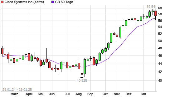 Mit dem Anstieg auf 56,91 EUR hat die Cisco-Aktie am 28.01.2025 die 50-Tage-Linie nach oben gekreuzt.