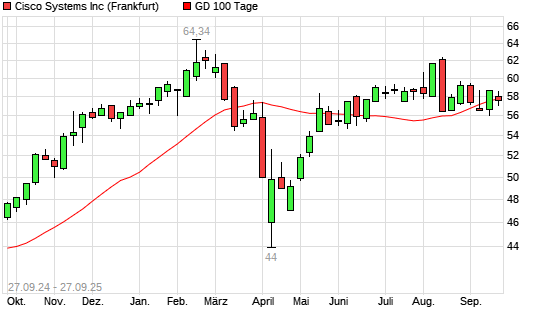 Mit dem Rücksetzer auf 57,57 EUR hat die Cisco-Aktie am 26.09.2025 die 100-Tage-Linie nach unten gekreuzt.