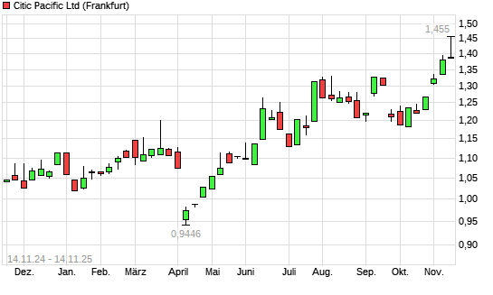Mit dem Anstieg auf 1,45 EUR hat die Citic Pacific-Aktie (ISIN HK0267001375) am 13.11.2025 ein neues 5-Jahres-Hoch erreicht und damit den Kurs vom 12.11.2025 eingestellt.