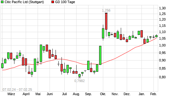 Mit dem Anstieg auf 1,09 EUR hat die Citic Pacific-Aktie am 06.02.2025 die 100-Tage-Linie nach oben gekreuzt.