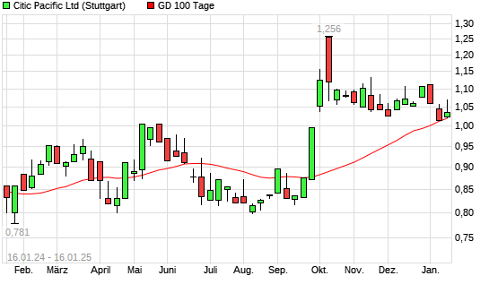 Mit dem Rücksetzer auf 1,02 EUR hat die Citic Pacific-Aktie am 15.01.2025 die 100-Tage-Linie nach unten gekreuzt.