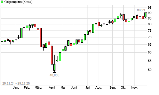 Mit dem Anstieg auf 89,30 EUR hat die Citigroup-Aktie (ISIN US1729674242) am 28.11.2025 ein neues 10-Jahres-Hoch erreicht und damit den Kurs vom 04.11.2025 eingestellt.