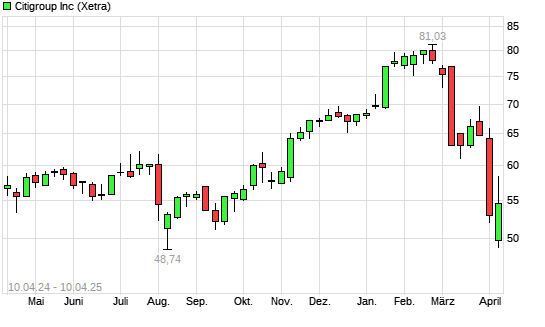 Mit dem Rücksetzer auf 52,54 EUR hat die Citigroup-Aktie (ISIN US1729674242) am 09.04.2025 ein neues 6-Monats-Tief erreicht und damit den Kurs vom 08.04.2025 eingestellt.
