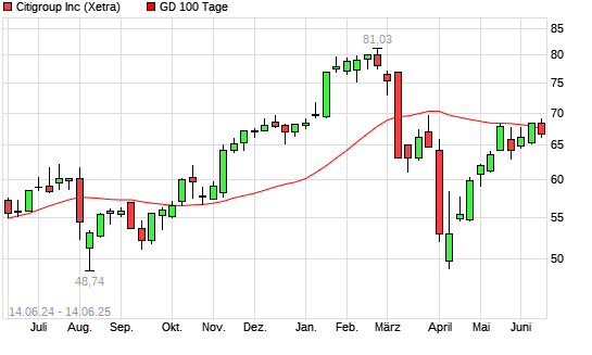 Mit dem Rücksetzer auf 66,50 EUR hat die Citigroup-Aktie am 13.06.2025 die 100-Tage-Linie nach unten gekreuzt.
