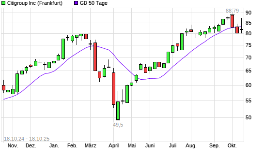 Mit dem Rücksetzer auf 82,14 EUR hat die Citigroup-Aktie am 17.10.2025 die 50-Tage-Linie nach unten gekreuzt.