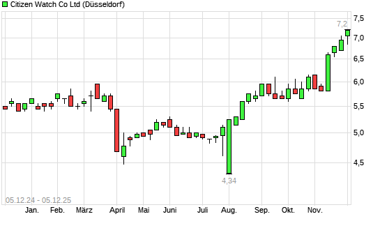 Mit dem Anstieg auf 7,15 EUR hat die Citizen-Aktie (ISIN JP3352400000) am 04.12.2025 ein neues 10-Jahres-Hoch erreicht und damit den Kurs vom 01.12.2025 eingestellt.