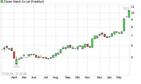 Mit dem Anstieg auf 9,80 EUR hat die Citizen-Aktie (ISIN JP3352400000) am 26.02.2026 ein neues 10-Jahres-Hoch erreicht und damit den Kurs vom 25.02.2026 eingestellt.