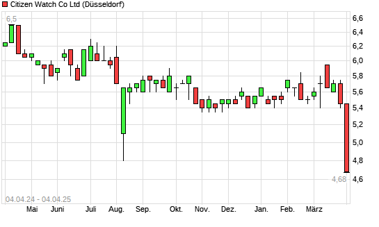 Mit dem Rücksetzer auf 5,15 EUR hat die Citizen-Aktie (ISIN JP3352400000) am 03.04.2025 ein neues 12-Monats-Tief erreicht und damit den Kurs vom 05.08.2024 eingestellt.
