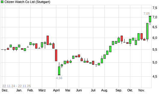 Mit dem Anstieg auf 7,00 EUR hat die Citizen-Aktie (ISIN JP3352400000) am 21.11.2025 ein neues 5-Jahres-Hoch erreicht und damit den Kurs vom 20.02.2024 eingestellt.