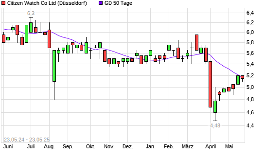 Mit dem Rücksetzer auf 5,15 EUR hat die Citizen-Aktie am 22.05.2025 die 50-Tage-Linie nach unten gekreuzt.