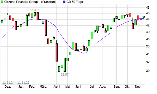 Mit dem Anstieg auf 44,70 EUR hat die Citizens Financial Group-Aktie am 10.11.2025 die 50-Tage-Linie nach oben gekreuzt.