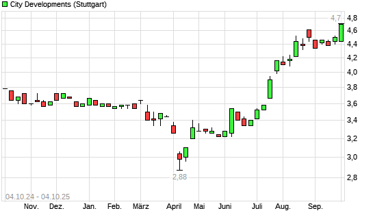 Mit dem Anstieg auf 4,68 EUR hat die City Developments-Aktie (ISIN SG1R89002252) am 03.10.2025 ein neues 12-Monats-Hoch erreicht und damit den Kurs vom 25.08.2025 eingestellt.