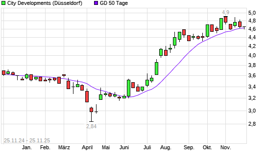 Mit dem Anstieg auf 4,66 EUR hat die City Developments-Aktie am 24.11.2025 die 50-Tage-Linie nach oben gekreuzt.