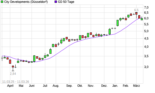 Mit dem Anstieg auf 6,15 EUR hat die City Developments-Aktie am 10.03.2026 die 50-Tage-Linie nach oben gekreuzt.
