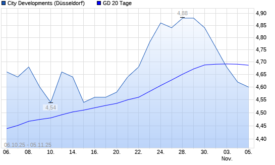 Mit dem Rücksetzer auf 4,66 EUR hat die City Developments-Aktie am 04.11.2025 die 20-Tage-Linie nach unten gekreuzt.
