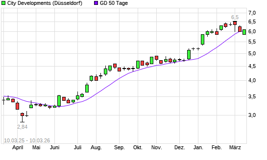 Mit dem Rücksetzer auf 5,90 EUR hat die City Developments-Aktie am 09.03.2026 die 50-Tage-Linie nach unten gekreuzt.