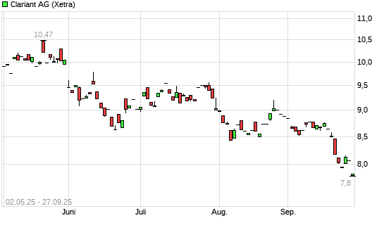 Mit dem Rücksetzer auf 7,80 EUR hat die Clariant-Aktie (ISIN CH0012142631) am 26.09.2025 ein neues 10-Jahres-Tief erreicht und damit den Kurs vom 22.09.2025 eingestellt.