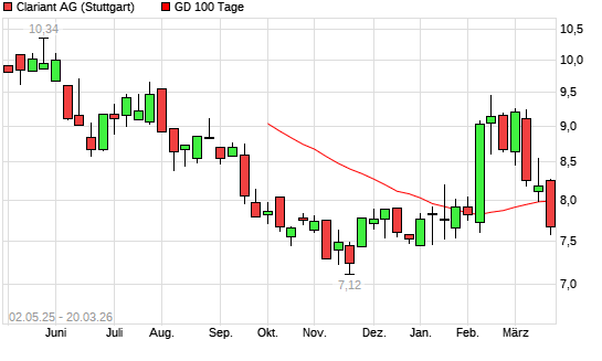 Mit dem Rücksetzer auf 7,90 EUR hat die Clariant-Aktie am 19.03.2026 die 100-Tage-Linie nach unten gekreuzt.