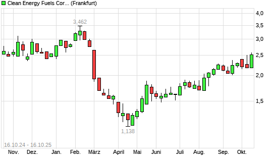 Mit dem Anstieg auf 2,52 EUR hat die Clean Energy Fuels Corp-Aktie (ISIN US1844991018) am 15.10.2025 ein neues 6-Monats-Hoch erreicht und damit den Kurs vom 13.10.2025 eingestellt.Die Clean ...weiterlesen