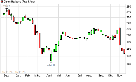 Mit dem Rücksetzer auf 173,65 EUR hat die Clean Harbors-Aktie (ISIN US1844961078) am 14.11.2025 ein neues 6-Monats-Tief erreicht und damit den Kurs vom 07.11.2025 eingestellt.