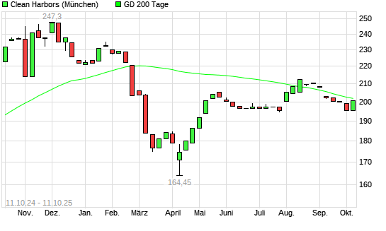 Mit dem Rücksetzer auf 199,20 EUR hat die Clean Harbors-Aktie am 10.10.2025 die 200-Tage-Linie nach unten gekreuzt.