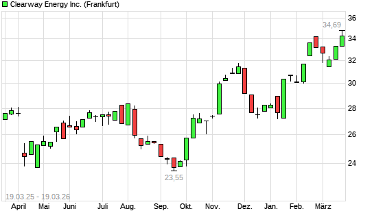 Mit dem Anstieg auf 34,69 EUR hat die Clearway Energy C-Aktie (ISIN US18539C2044) am 18.03.2026 ein neues 3-Jahres-Hoch erreicht und damit den Kurs vom 16.02.2026 eingestellt.Die ...weiterlesen