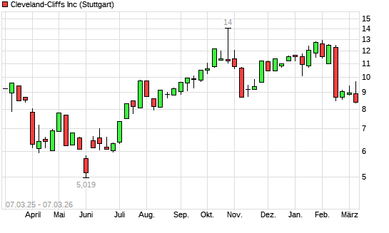 Mit dem Rücksetzer auf 8,44 EUR hat die Cleveland-Cliffs-Aktie (ISIN US1858991011) am 06.03.2026 ein neues 6-Monats-Tief erreicht und damit den Kurs vom 17.02.2026 eingestellt.