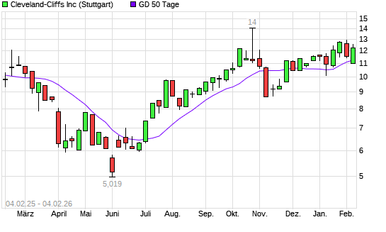 Mit dem Anstieg auf 11,94 EUR hat die Cleveland-Cliffs-Aktie am 03.02.2026 die 50-Tage-Linie nach oben gekreuzt.