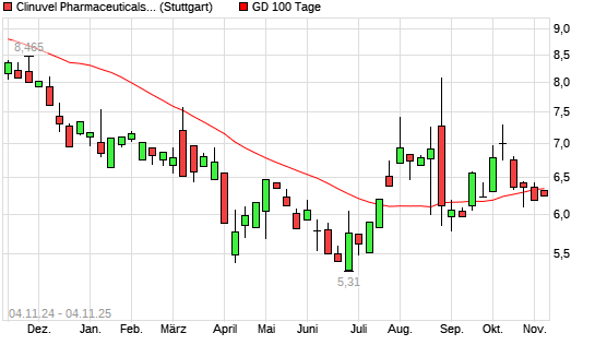 Mit dem Rücksetzer auf 6,30 EUR hat die Clinuvel Pharmaceuticals-Aktie am 03.11.2025 die 100-Tage-Linie nach unten gekreuzt.