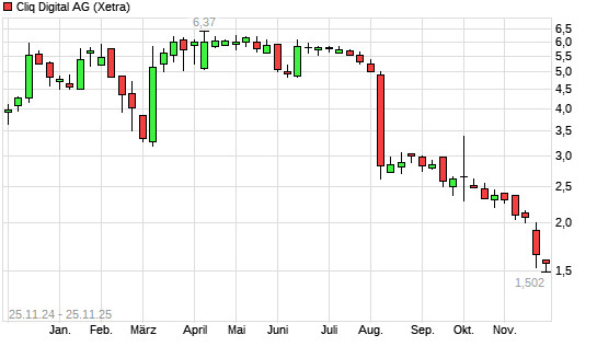 Mit dem Rücksetzer auf 1,46 EUR hat die Cliq Digital-Aktie (ISIN DE000A35JS40) am 24.11.2025 ein neues 10-Jahres-Tief erreicht und damit den Kurs vom 20.11.2025 eingestellt.