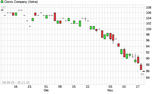 Mit dem Rücksetzer auf 86,00 EUR hat die Clorox-Aktie (ISIN US1890541097) am 19.11.2025 ein neues 10-Jahres-Tief erreicht und damit den Kurs vom 18.11.2025 eingestellt.
