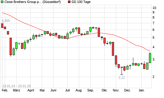 Mit dem Rücksetzer auf 3,46 EUR hat die Close Brothers Group-Aktie am 22.01.2025 die 100-Tage-Linie nach unten gekreuzt.