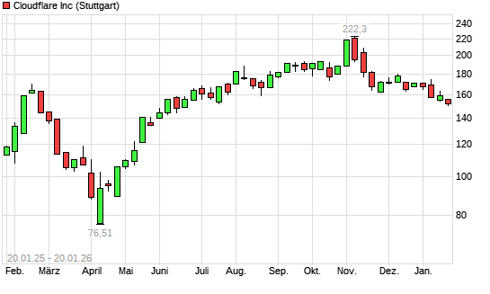 Mit dem Rücksetzer auf 153,56 EUR hat die Cloudflare A-Aktie (ISIN US18915M1071) am 19.01.2026 ein neues 6-Monats-Tief erreicht und damit den Kurs vom 09.01.2026 eingestellt.