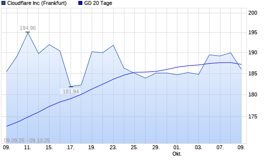 Mit dem Anstieg auf 190,20 EUR hat die Cloudflare A-Aktie am 08.10.2025 die 20-Tage-Linie nach oben gekreuzt.