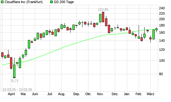 Mit dem Anstieg auf 172,74 EUR hat die Cloudflare A-Aktie am 09.03.2026 die 200-Tage-Linie nach oben gekreuzt.
