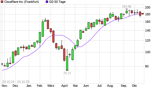 Mit dem Rücksetzer auf 181,16 EUR hat die Cloudflare A-Aktie am 23.10.2025 die 50-Tage-Linie nach unten gekreuzt.
