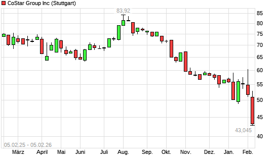 Mit dem Rücksetzer auf 43,74 EUR hat die CoStar-Aktie (ISIN US22160N1090) am 04.02.2026 ein neues 5-Jahres-Tief erreicht und damit den Kurs vom 23.02.2022 eingestellt.
