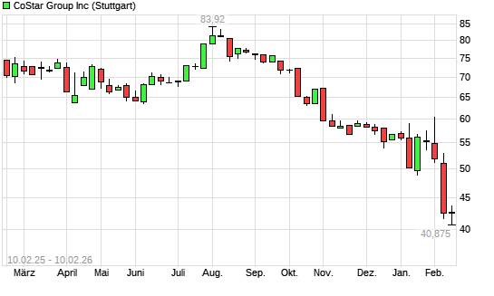 Mit dem Rücksetzer auf 41,73 EUR hat die CoStar-Aktie (ISIN US22160N1090) am 09.02.2026 ein neues 5-Jahres-Tief erreicht und damit den Kurs vom 06.02.2026 eingestellt.