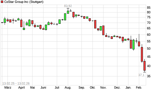 Mit dem Rücksetzer auf 39,70 EUR hat die CoStar-Aktie (ISIN US22160N1090) am 12.02.2026 ein neues 5-Jahres-Tief erreicht und damit den Kurs vom 09.02.2026 eingestellt.