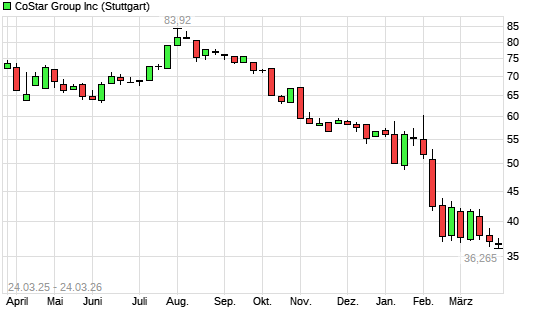 Mit dem Rücksetzer auf 36,10 EUR hat die CoStar-Aktie (ISIN US22160N1090) am 23.03.2026 ein neues 5-Jahres-Tief erreicht und damit den Kurs vom 19.03.2026 eingestellt.