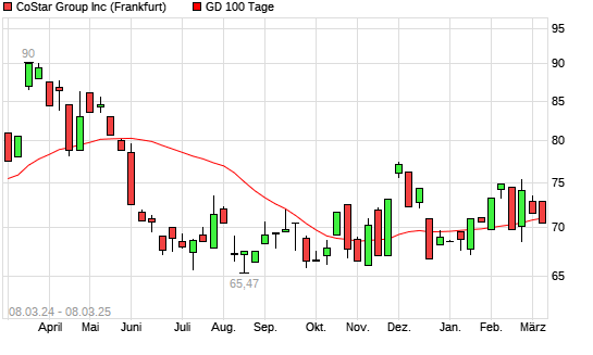 Mit dem Rücksetzer auf 70,56 EUR hat die CoStar-Aktie am 07.03.2025 die 100-Tage-Linie nach unten gekreuzt.