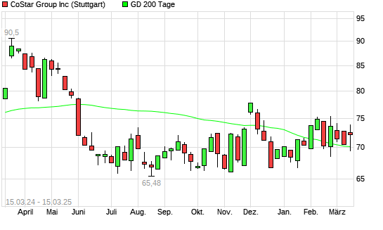 Die CoStar-Aktie befand sich seit dem 20.02.2025 im langfristigen Aufwärtstrend und hat in diesem Zeitraum -1,05% an Wert verloren.