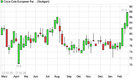 Mit dem Anstieg auf 83,60 EUR hat die Coca-Cola Europacific Partners-Aktie (ISIN GB00BDCPN049) am 16.02.2026 ein neues 6-Monats-Hoch erreicht und damit den Kurs vom 13.02.2026 eingestellt.
