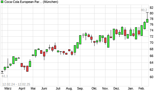 Mit dem Anstieg auf 78,50 EUR hat die Coca-Cola Europacific Partners-Aktie (ISIN GB00BDCPN049) am 11.02.2025 ein neues All-Time-High erreicht und damit den Kurs vom 10.02.2025 eingestellt.
