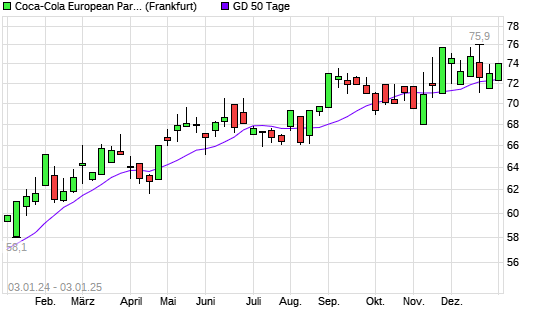 Mit dem Anstieg auf 73,40 EUR hat die Coca-Cola Europacific Partners-Aktie am 02.01.2025 die 50-Tage-Linie nach oben gekreuzt.
