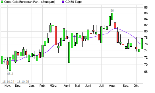 Mit dem Anstieg auf 77,40 EUR hat die Coca-Cola Europacific Partners-Aktie am 17.10.2025 die 50-Tage-Linie nach oben gekreuzt.